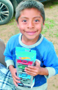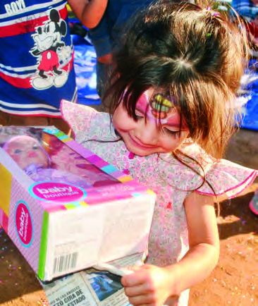 In Mexico, a typical Christmas meal is something like tamales. Turkey and stuffing are not a part of the meal, mainly because of the cost. But what the children really want are hotdogs with as many onions and jalapeños as possible. Each party includes cake and many other treats for the kids. We also bring in bouncy houses and carnival games.
